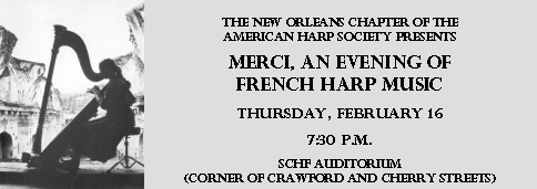Merci, An Evening of French Harp MusicSCHF is pleased and proud to welcome the New Orleans chapter of the American Harp Society to present Merci, An Evening of French Harp Music on Thursday, February 16 at 7:30 p.m. in the SCHF Auditorium. After Hurricane Katrina, many New Orleans and Gulf Coast harpist were left homeless and with damaged or destroyed instruments. Immediately, an overwhelming number of harpists across the nation and the world began hosting fundraisers and benefit concerts to assist their fellow musicians in their hour of need.